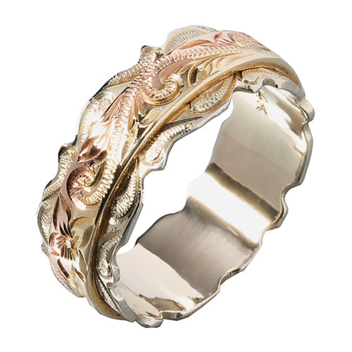 14K Tri-Color Gold Custom-Made Hawaiian Scroll Engraving Double Cut Out Edge Ring