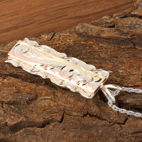 14K Tri-Color Gold Custom-Made Hawaiian Scroll Raised Vertical Pendant Cut Out Edge