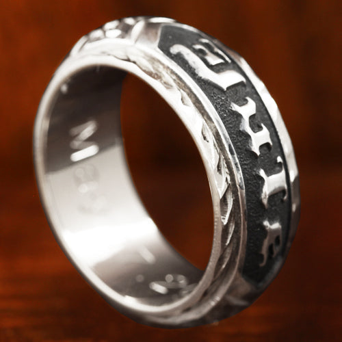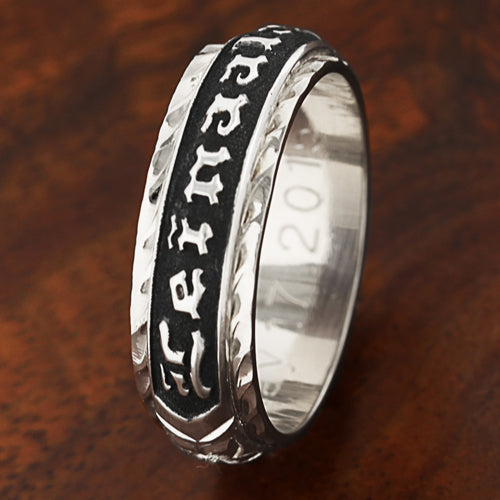 14K White Gold/Sterling Silver Custom-Made Plumeria Scroll Double Raise Letter Diamond Cut Edge Ring (Thickness 2.5mm)