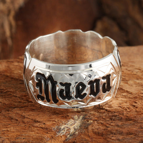 This beautiful Hawaiian Heirloom ring is made with 14 karat gold with black enamel letter custom name.