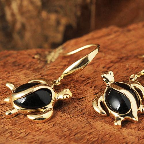 14K Yellow Gold Black Coral Inlaid Honu (Hawaiian Turtle) Hook Earrings