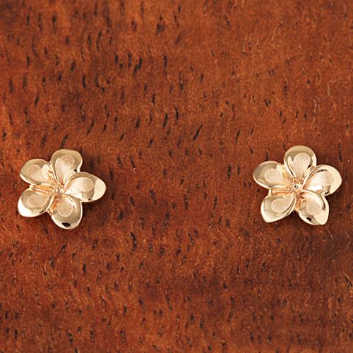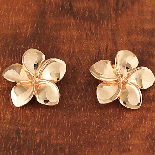 Solid 14K Pink Gold Plumeria Post Earrings Sandblast Polish Edge