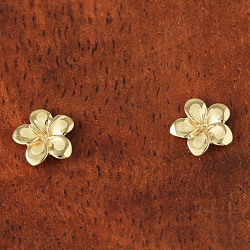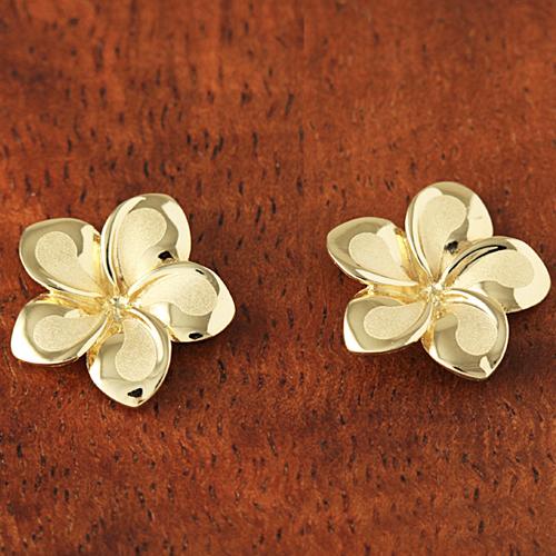 Solid 14K Yellow Gold Plumeria Post Earrings Sandblast Polish Edge