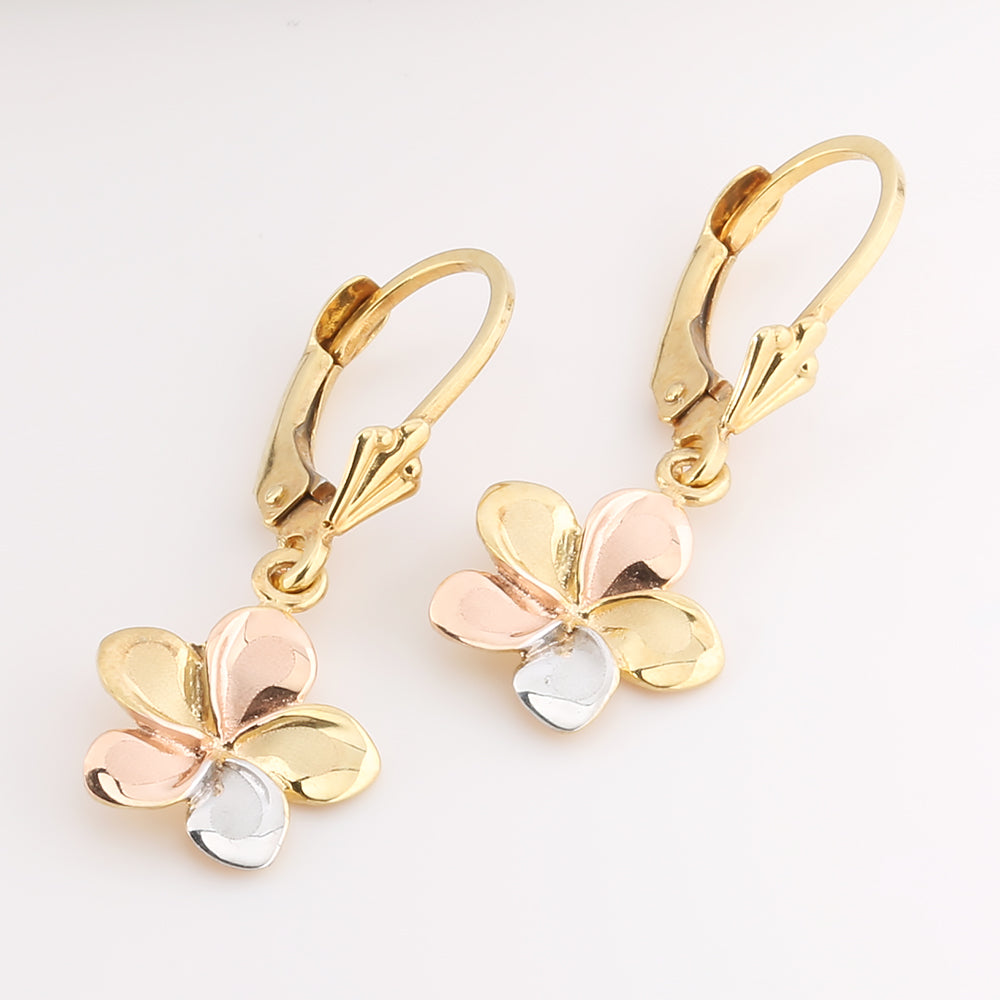 14K Solid Gold Tri-Color Plumeria Leverback Earring 12.5mm