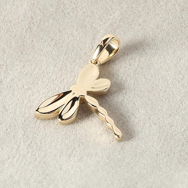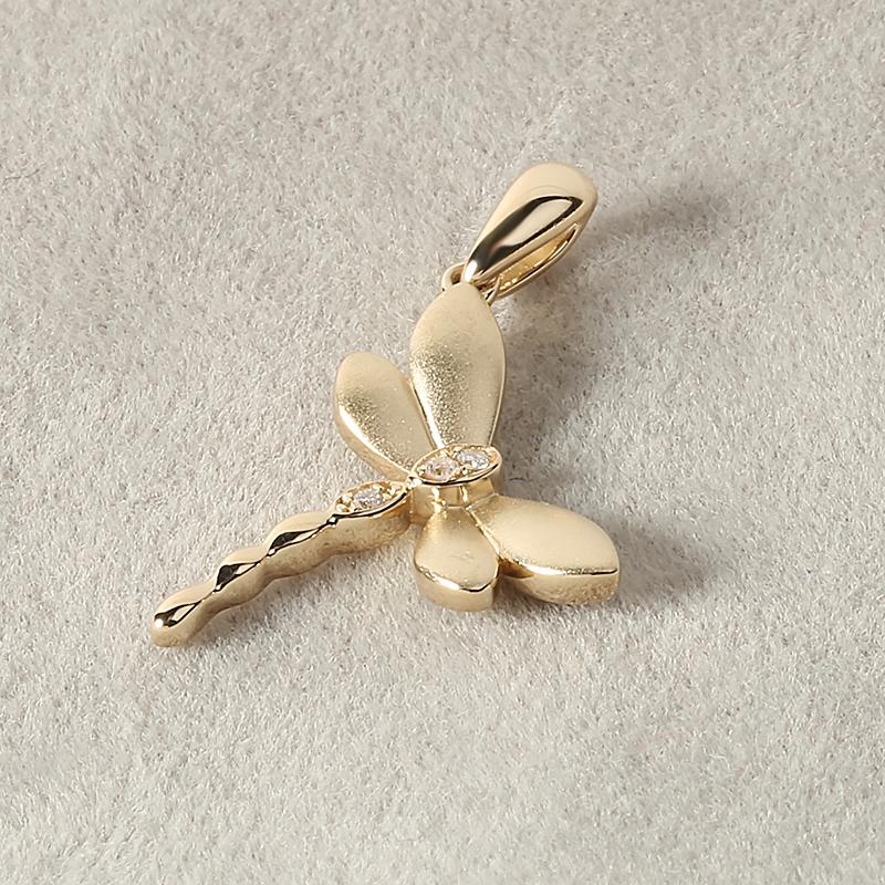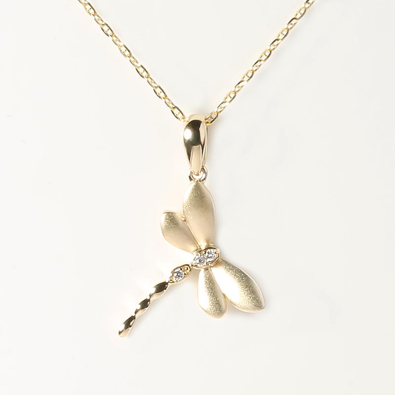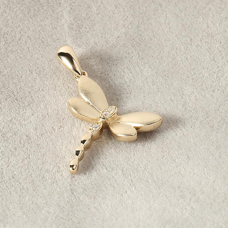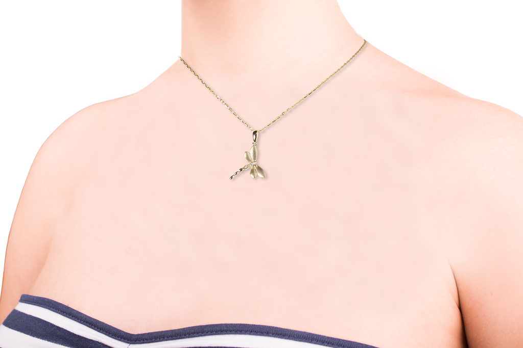 This beautiful dragonfly pendant is made with 14 karat yellow gold with small diamond inlay.
