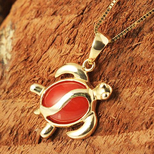 14K Yellow Gold Honu (Hawaiian Turtle) Red Coral Inlaid Pendant (Chain Sold Separately)