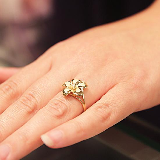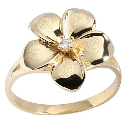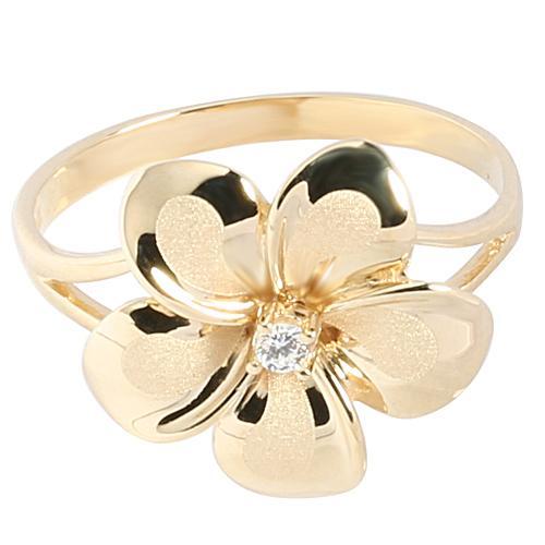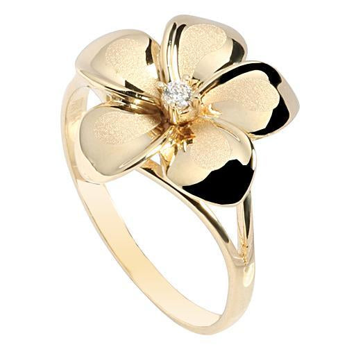 Solid 14K Yellow Gold Plumeria Ring with CZ Sandblast Polish Edge