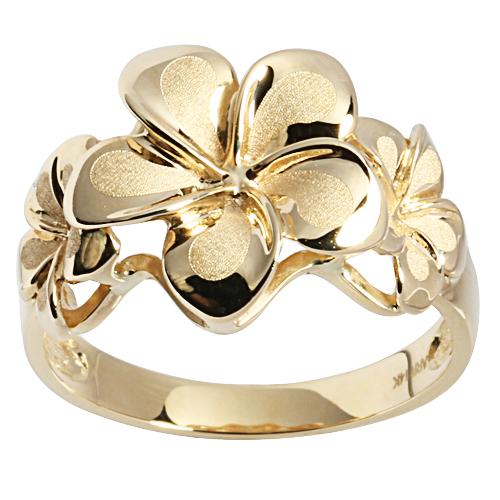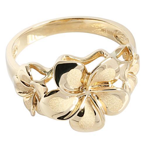 14K Yellow Gold Triple Plumeria Ring Sandblast Polish Edge (M)