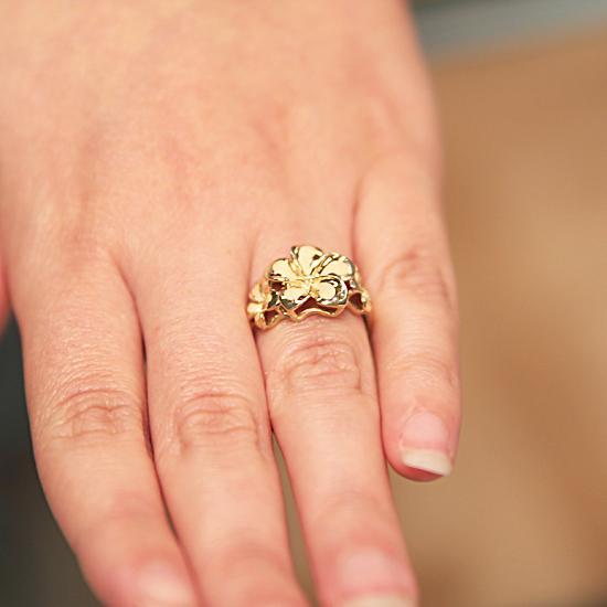 This ring is made with solid 14 Karat Gold, the Plumerias are sandblasted with a high polished edge.