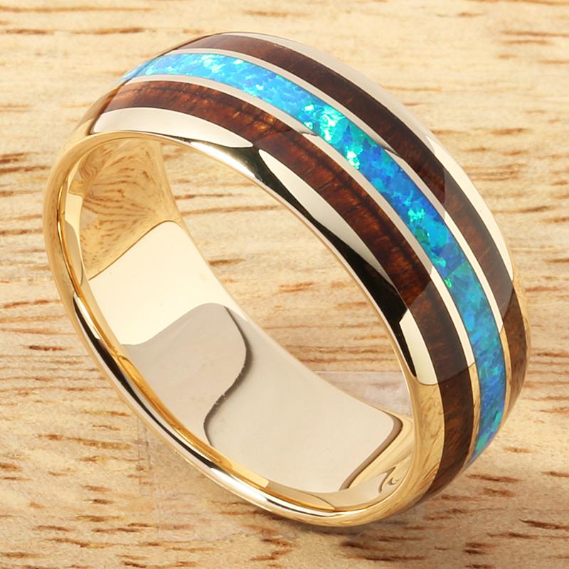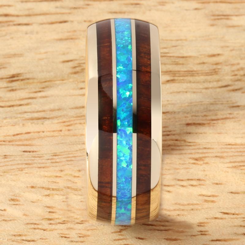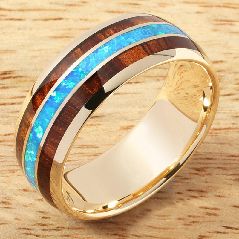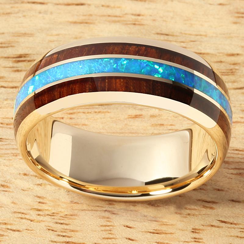 The Koa tree produces wood that is regarded as one of the most elegant and exotic of Hawaii's native woods and possesses ancient significance, giving the ring a special meaning. Recognized as one of the highest quality textured woods in the world, the use of Koa wood creates a ring that is light weight, comfortable, and brilliantly unique.