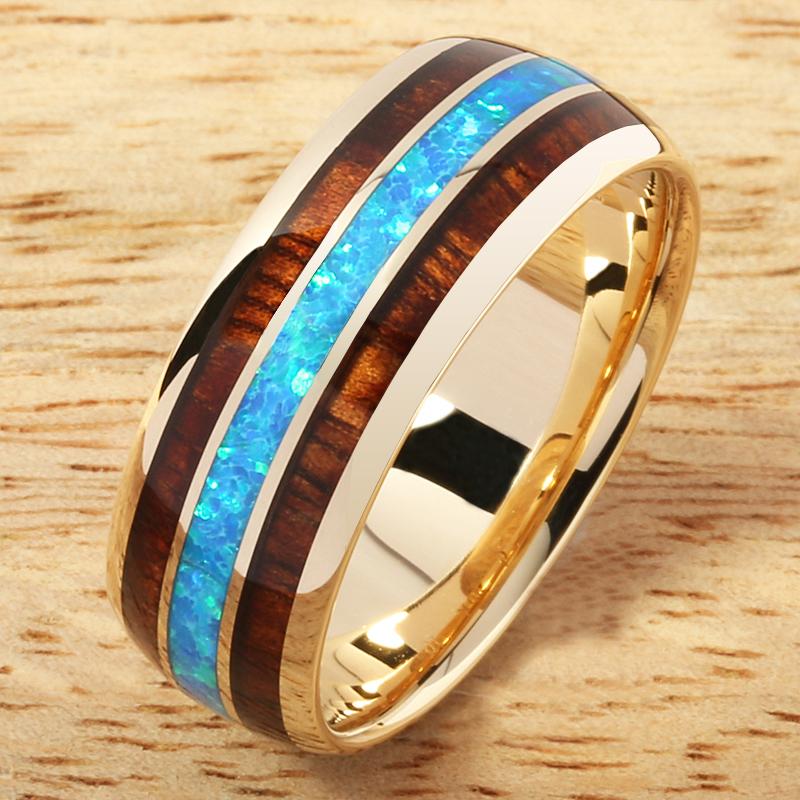 This Luxury Yellow Gold Koa Wood ring is made from Natural Hawaiian Koa Wood inlaid in Solid 10K Yellow Gold. The wood comes with a layer of resin which makes the ring waterproof.