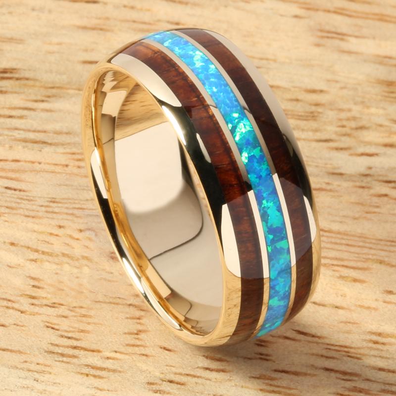 10K Yellow Gold Koa Wood/Opal Ring Triple Row Barrel/8mm