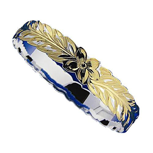 Sterling Silver Hawaiian Bangle Maile Leaf Engraving Cut Out Edge Two Tone Yellow Gold