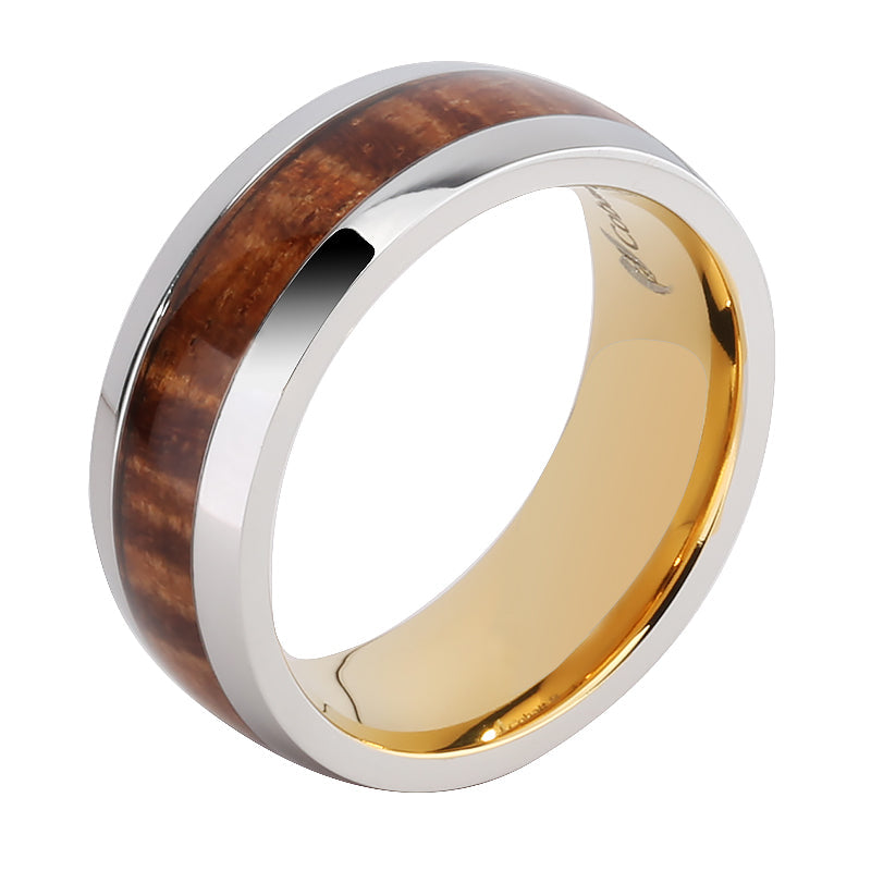 The Koa tree produces wood that is regarded as one of the most elegant and exotic of Hawaii's native woods and possesses ancient significance, giving the ring a special meaning. Recognized as one of the highest quality textured woods in the world, the use of Koa wood creates a ring that is light weight, comfortable, and brilliantly unique.