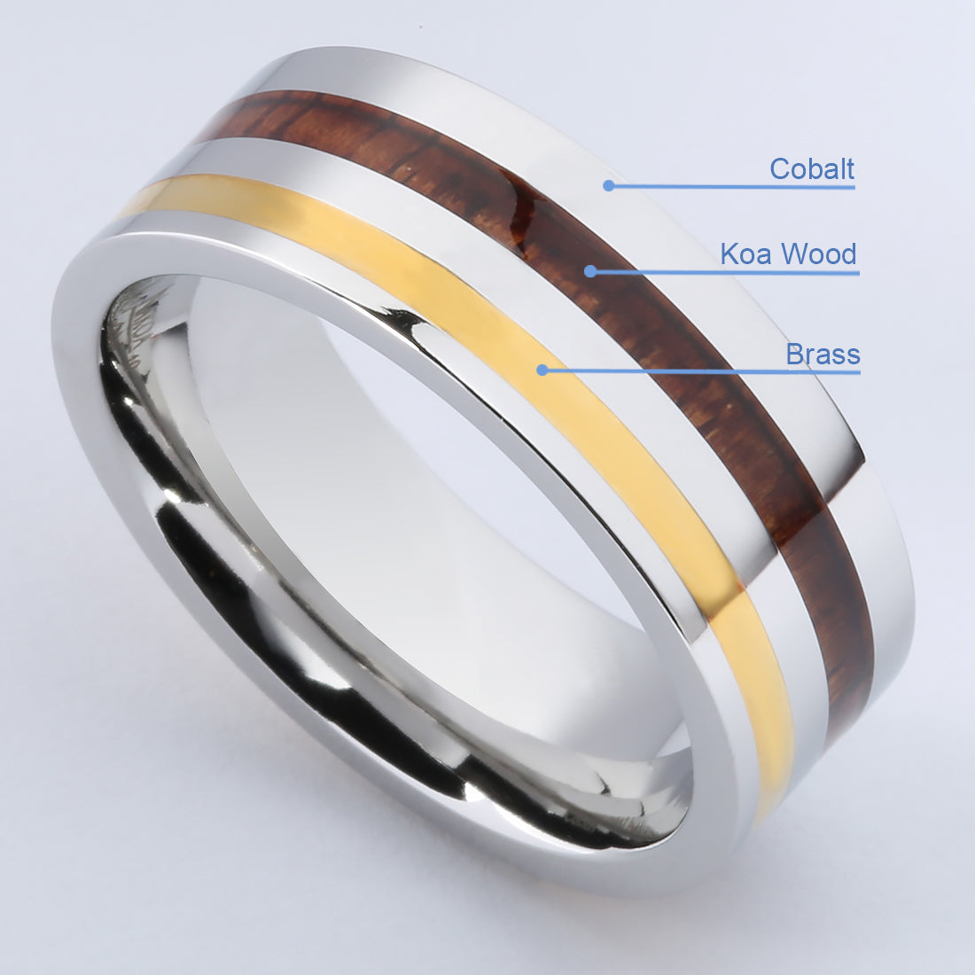 This beautiful ring is made from Cobalt, Hawaiian Koa Wood and Brass. Cobalt is a heavier, tough metal that does not tarnish and scratch resistant.