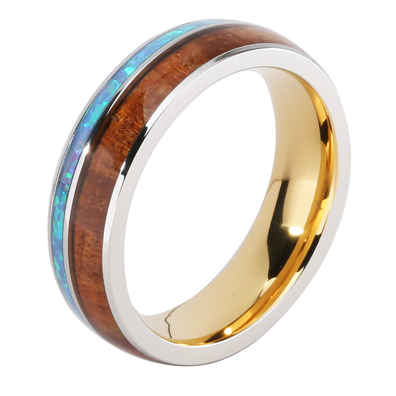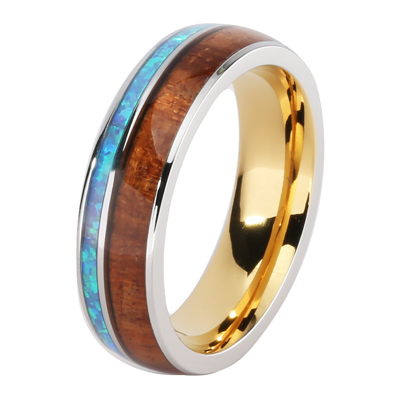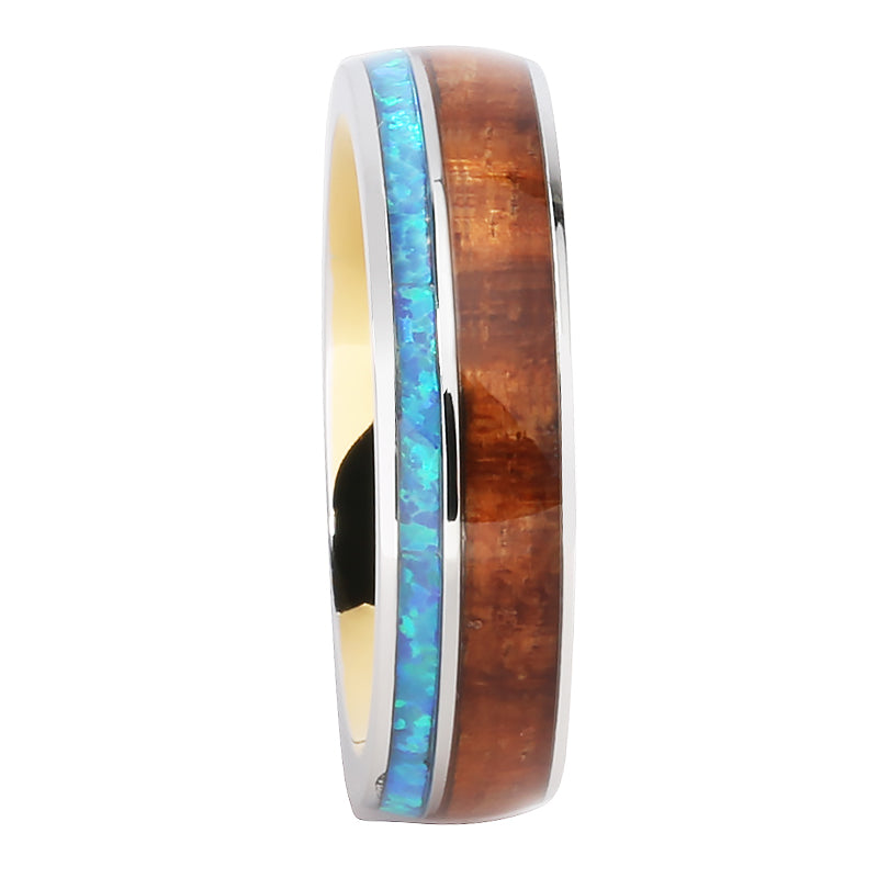 This beautiful ring is made from Natural Hawaiian Koa Wood and Blue Opal inlaid in Cobalt. Inside the ring is 14K Yellow Gold plated which creates a Two-Tone feature ring. Cobalt is a heavy, tough metal that does not tarnish and is scratch resistant. The wood comes with a layer of resin which makes the ring waterproof.
