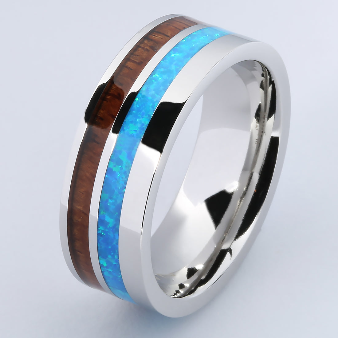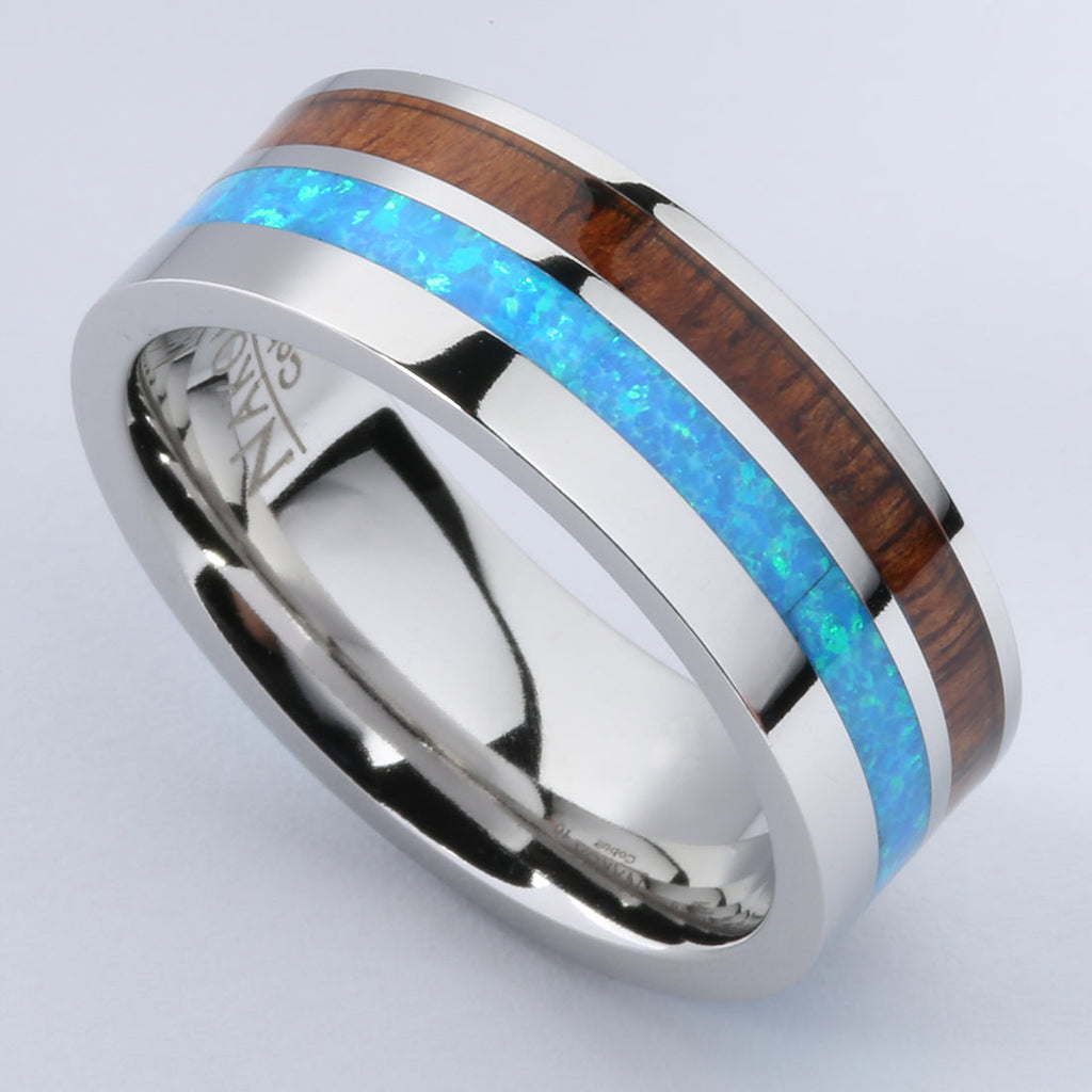 This beautiful ring is made from Cobalt, Blue Opal and Hawaiian Koa Wood. Cobalt is a heavier, tough metal that does not tarnish and scratch resistant.
