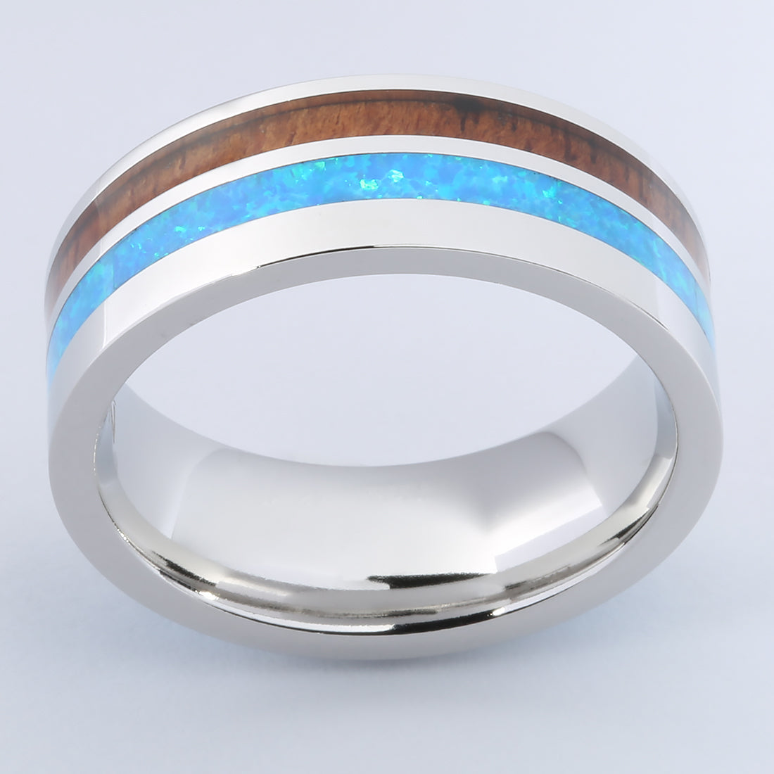 Cobalt Opal Wedding Ring with Koa Wood Flat 8mm