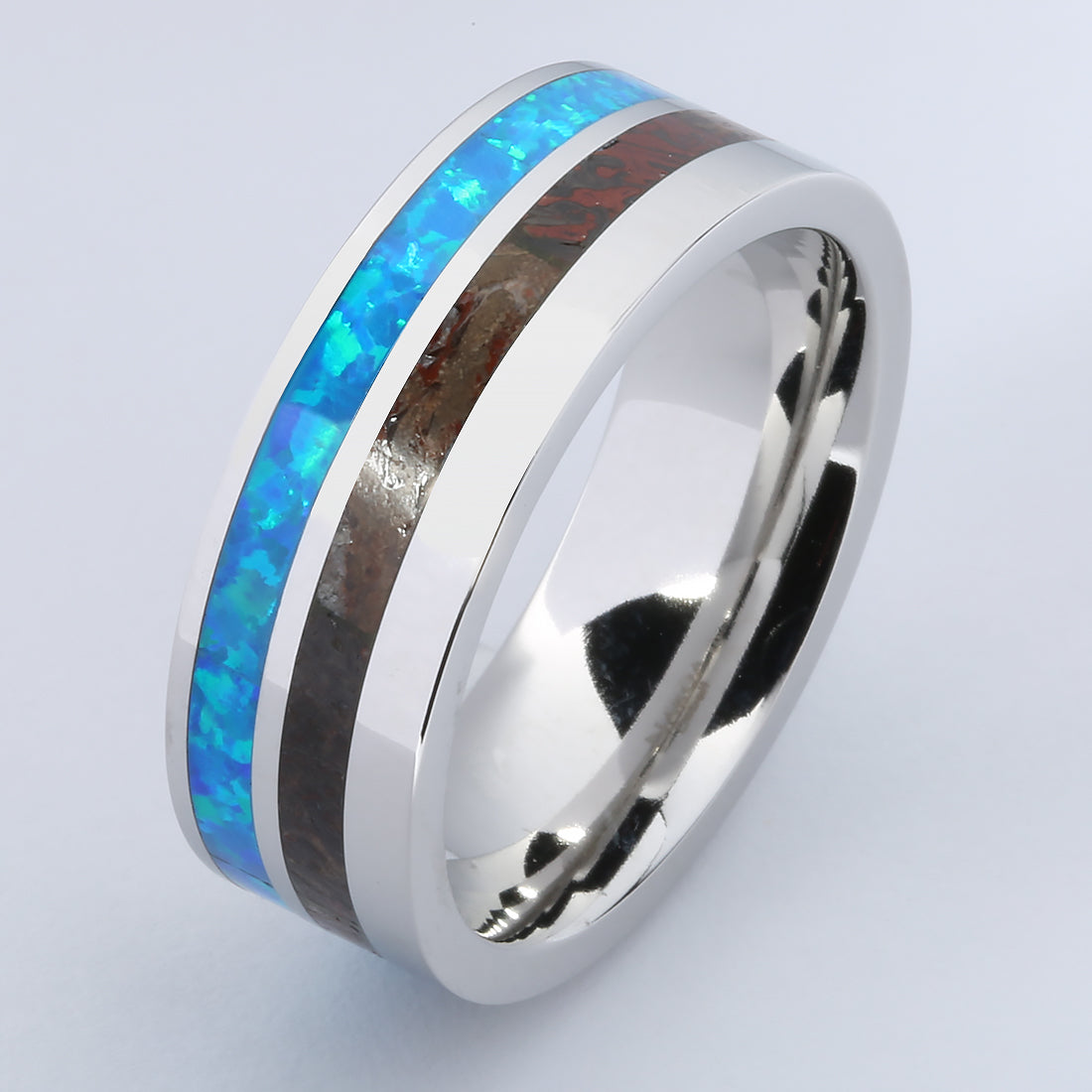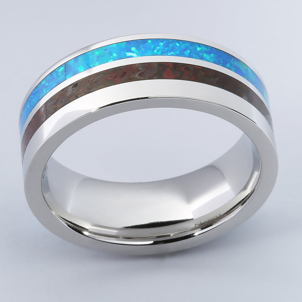 Cobalt Wedding Ring with Opal and Fossilized Dinosaur Bone Flat 8mm