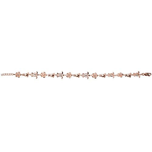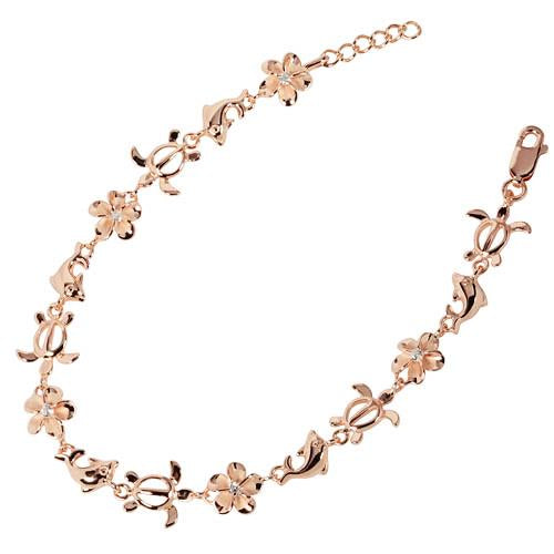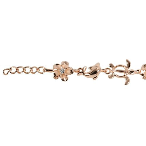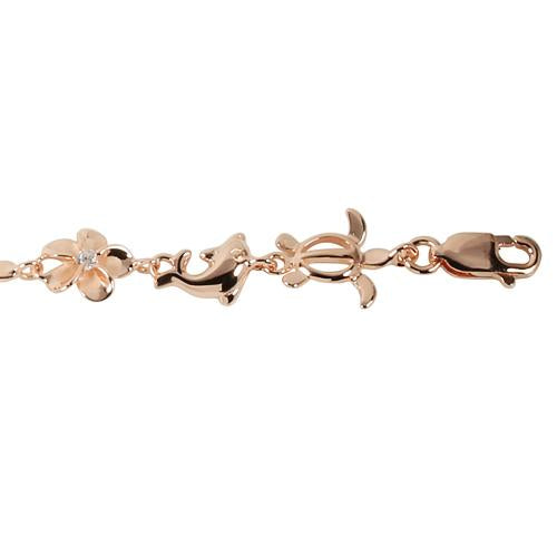 Solid 925 Sterling Silver Pink Gold Plated Honu (Hawaiian Turtle) Dolphin and Plumeria with CZ Bracelet