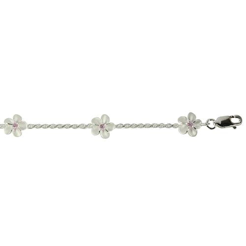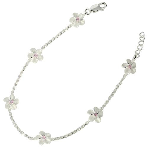 Solid 925 Sterling Silver Plumeria with Pink CZ Rope Chain Bracelet