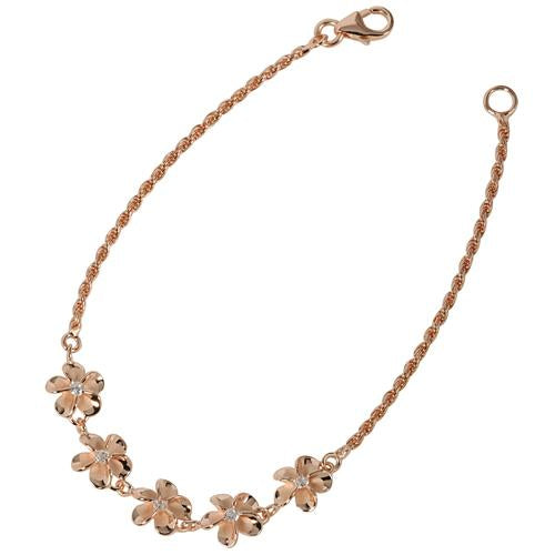 Solid 925 Sterling Silver Pink Gold Plated Plumeria with CZ Rope Chain Bracelet