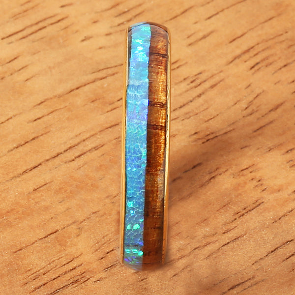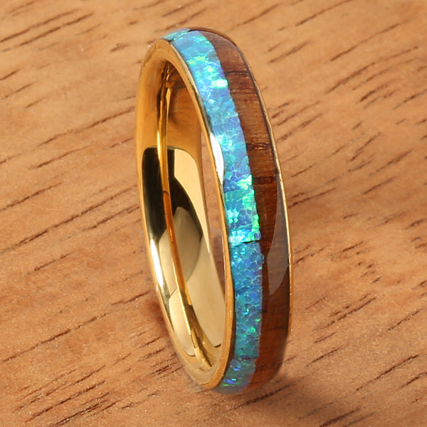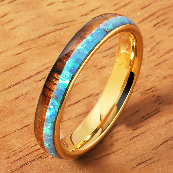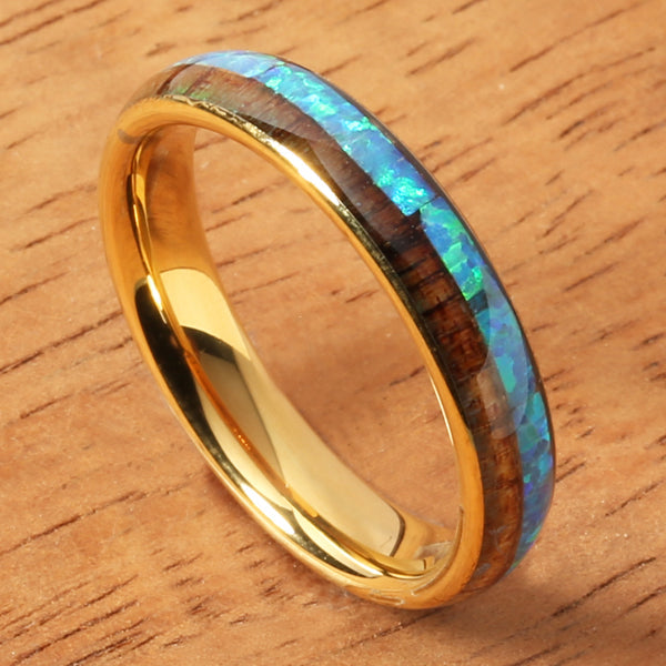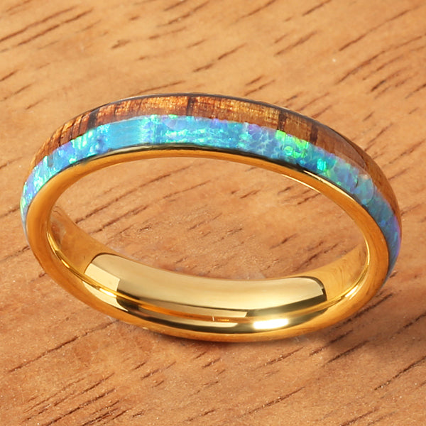 4mm Yellow Gold Tungsten Opal Hawaiian Koa Wood Ring Double Row Two Tone Dome Shape