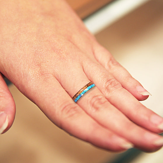 This beautiful ring is made from Natual Hawaiian Koa Wood and Blue Opal inlaid in Tungsten. Yelllow Gold Vacuum Plated. Tungsten is a heavier, tough metal that does not tarnish or scratch. The wood comes with a layer of resin which makes the ring waterproof.