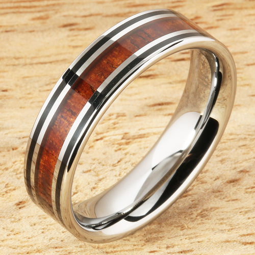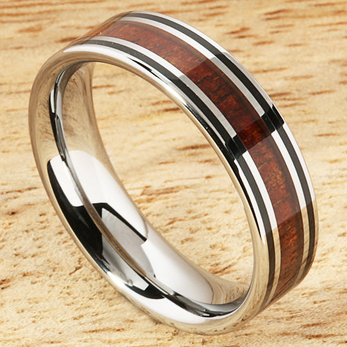 6mm Natural Hawaiian Koa Wood Inlaid Tungsten Double Line Wedding Ring