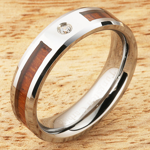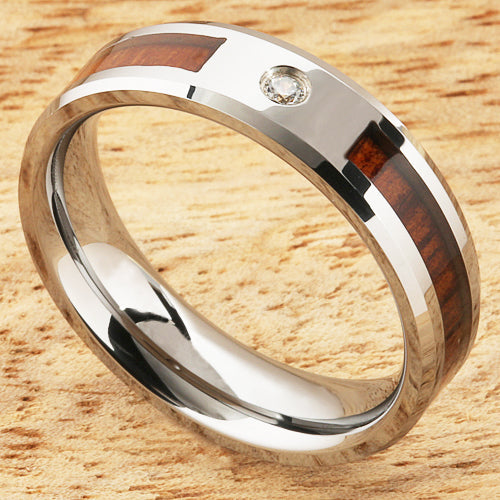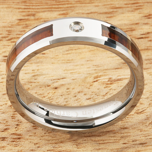 6mm Natural Hawaiian Koa Wood Inlaid Tungsten with CZ Beveled Edge Wedding Ring