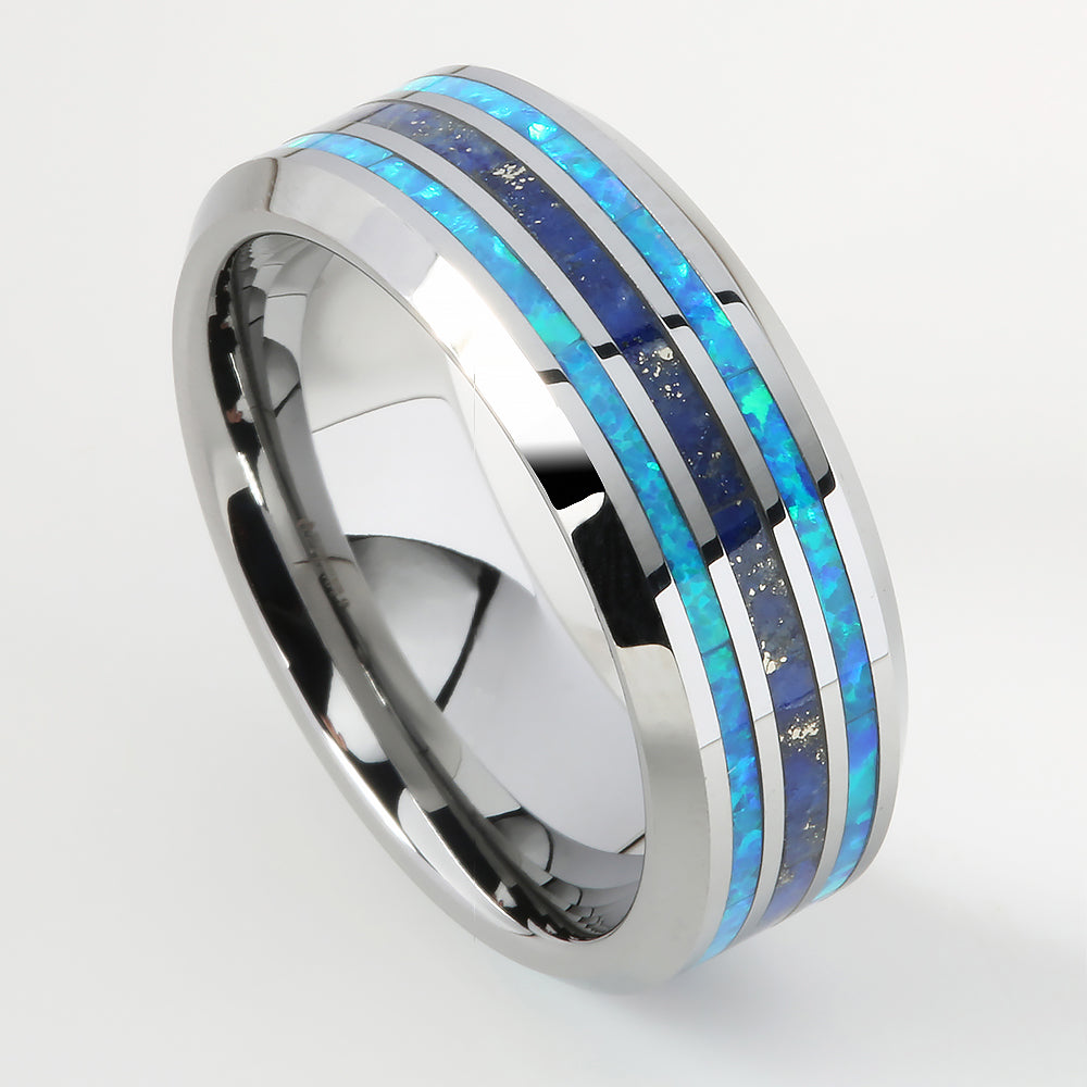 Tungsten Lapis Lazuli and Opal Inlaid Triple Row Beveled Edge Wedding Ring 8mm