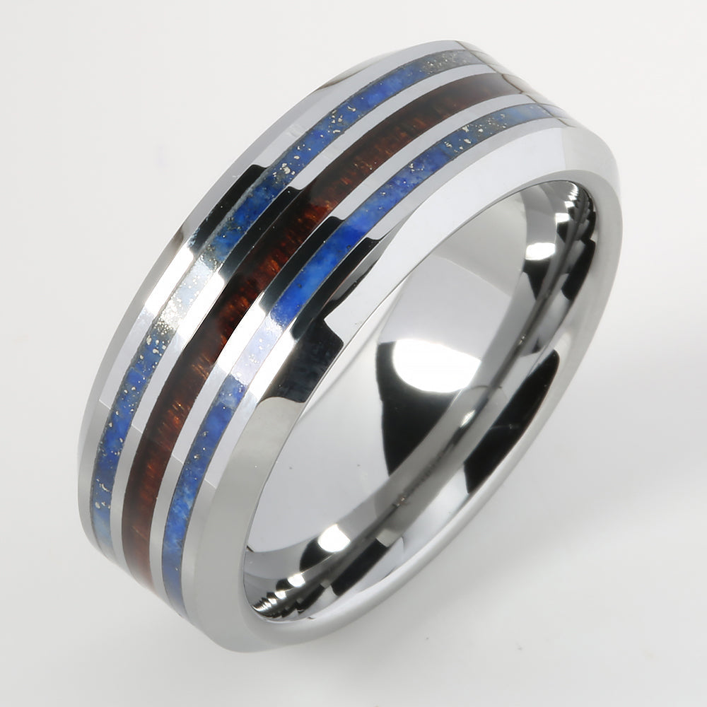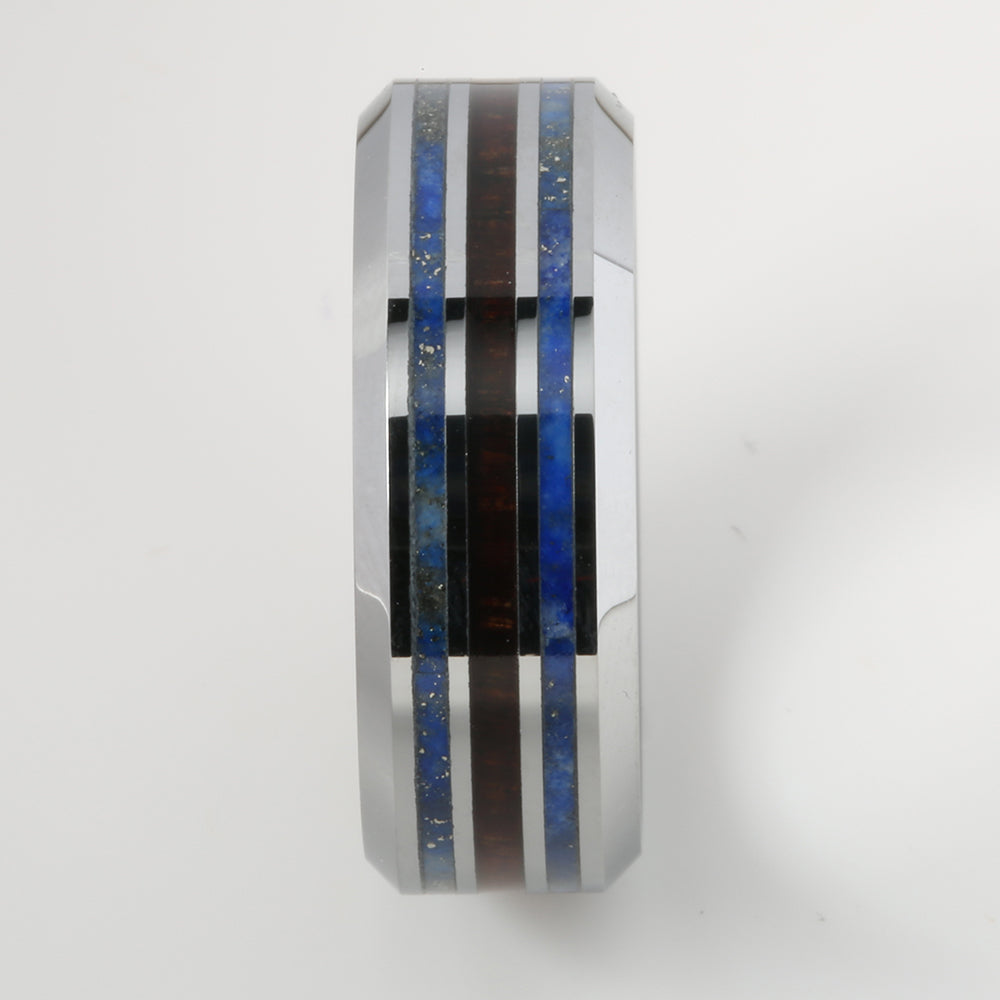 Tungsten Lapis Lazuli and Hawaiian Koa Wood Inlaid Triple Row Beveled Edge Wedding Ring 8mm