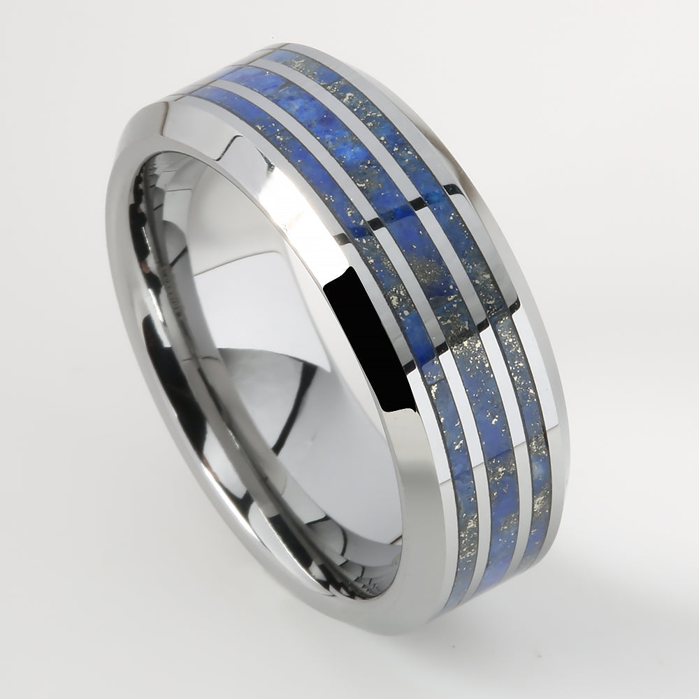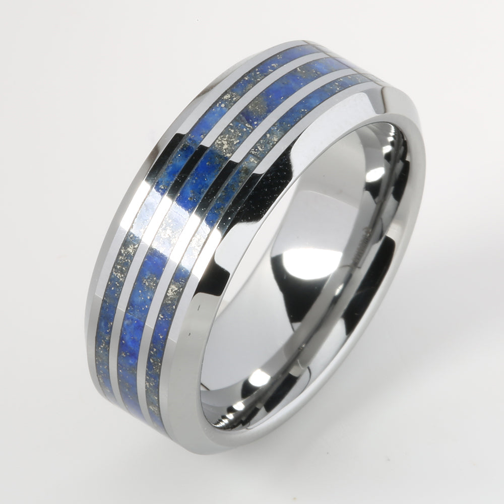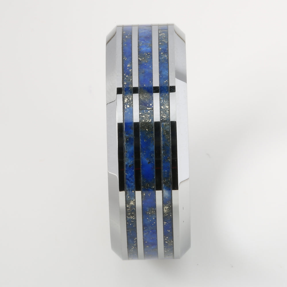 Tungsten Lapis Lazuli Inlaid Triple Row Beveled Edge Wedding Ring 8mm