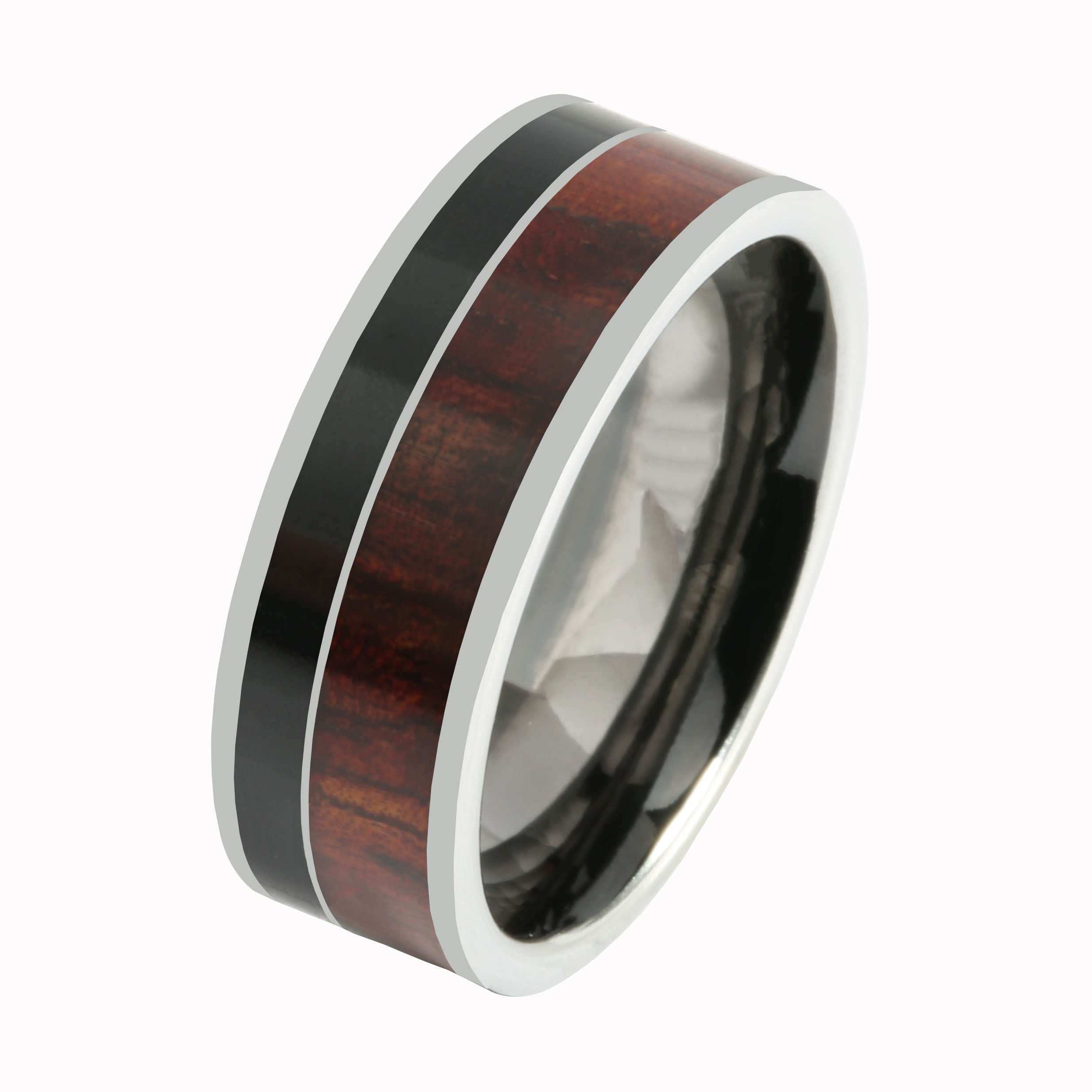 Tungsten Koa Wood and Onyx Inlaid Wedding Ring Flat 8mm