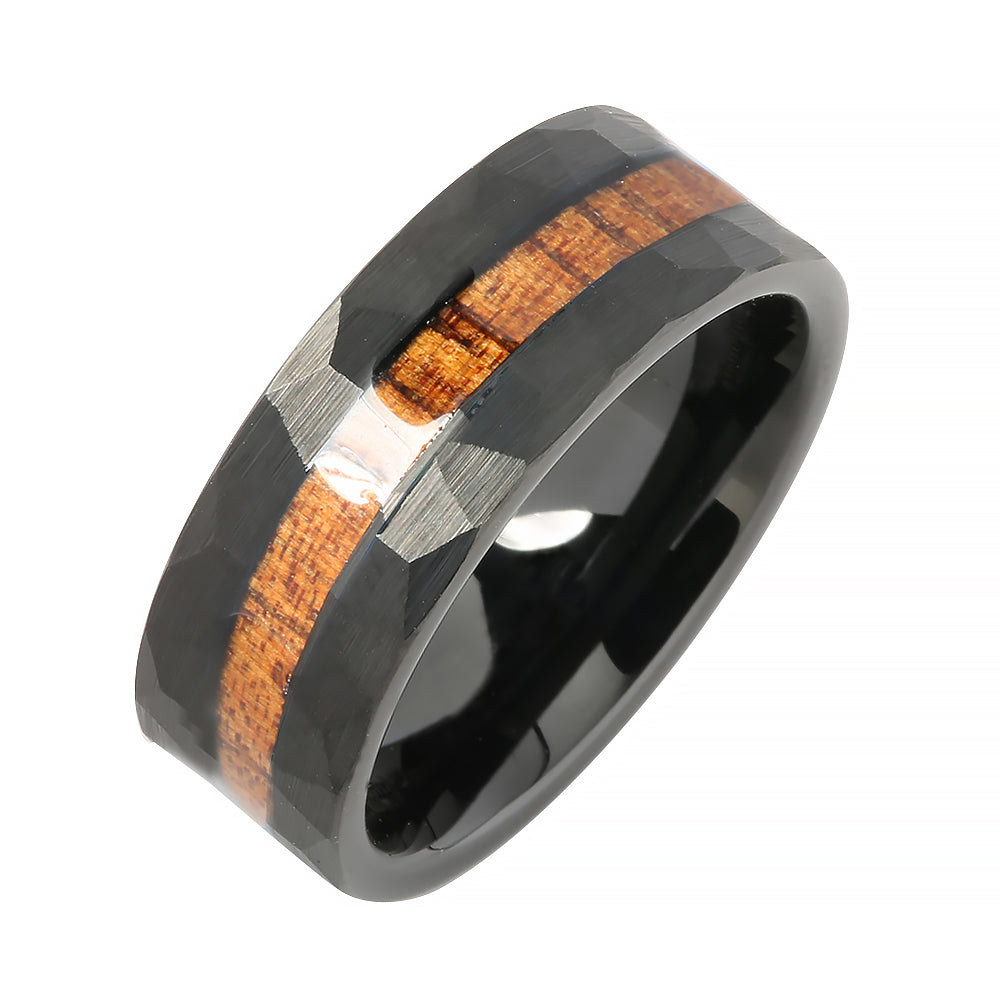 Black Tungsten Hawaiian Koa Wood Inlaid Diamond Cut Flat Wedding Ring 8mm
