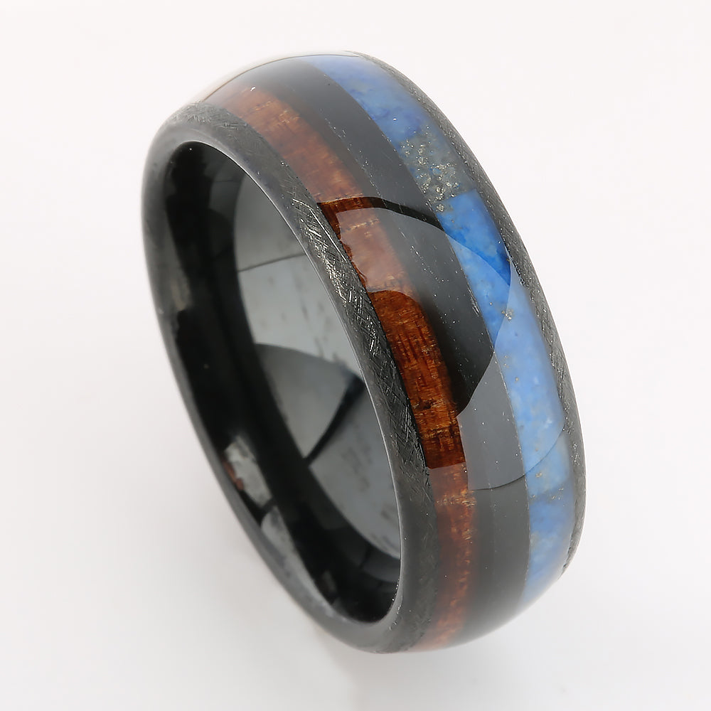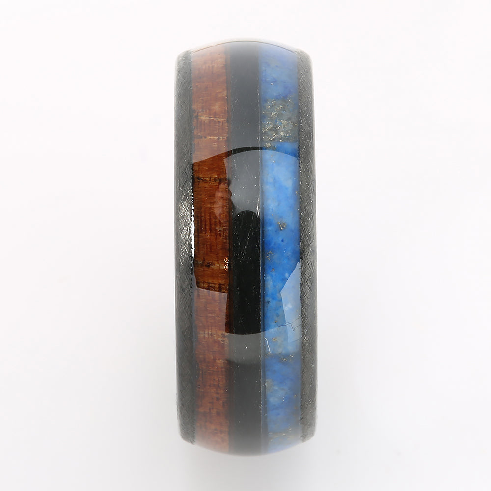 Black Tungsten Hawaiian Koa Wood and Lapis Lazuli Inlaid Double Row Oval Wedding Ring 8mm