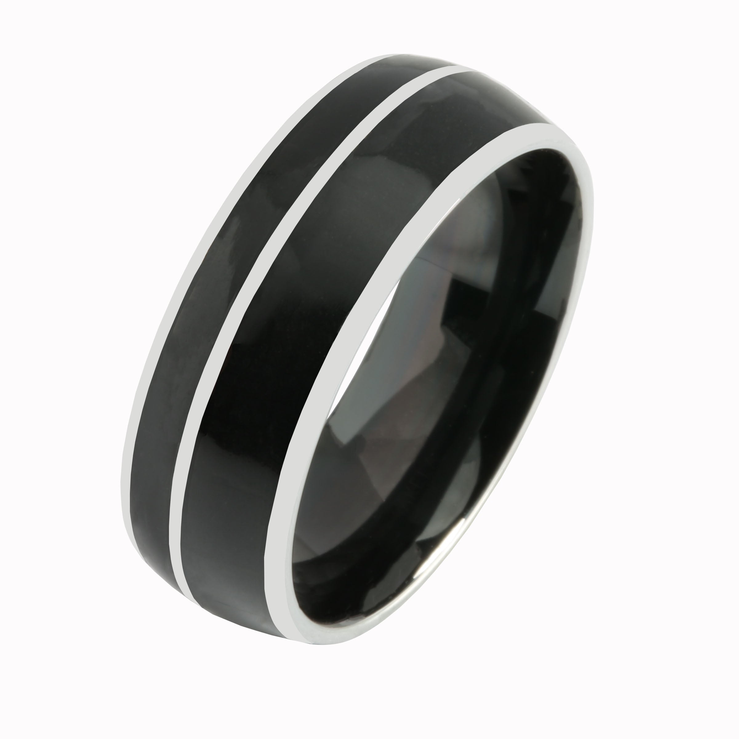 This beautiful ring is made with Onyx inlaid in Tungsten. Tungsten is a heavier, tough metal that does not tarnish or scratch.