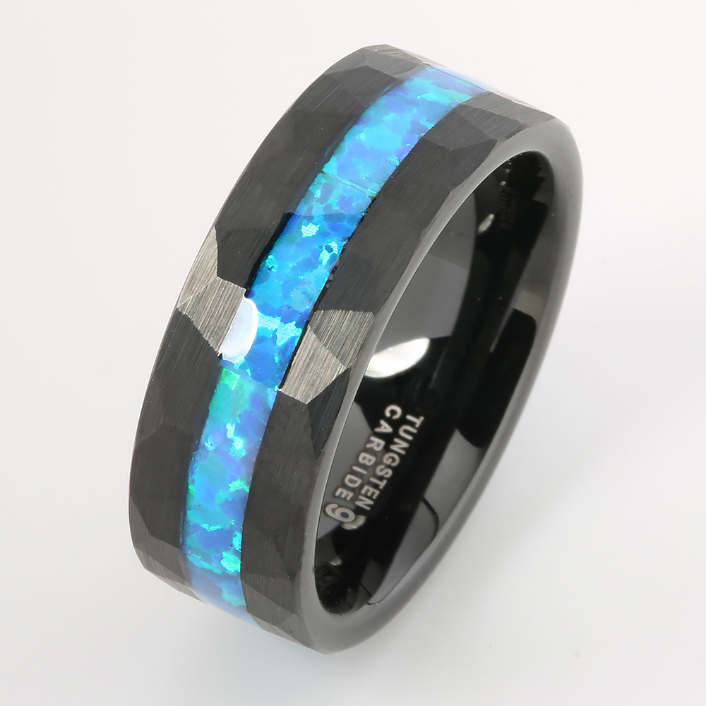 Black Tungsten Opal Inlaid Diamond Cut Flat Wedding Ring 8mm