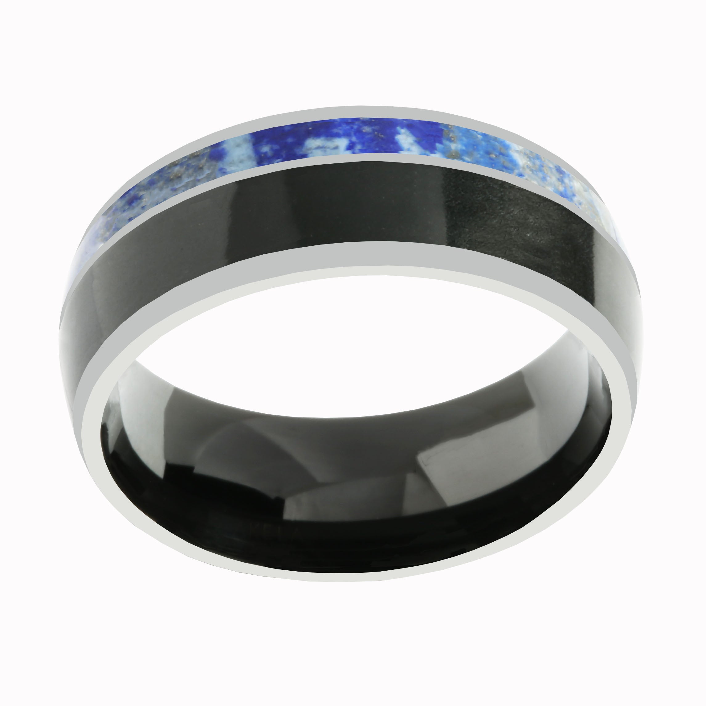 This beautiful ring is made with Lapis Lazuli and Onyx inlaid in Tungsten. Tungsten is a heavier, tough metal that does not tarnish or scratch.