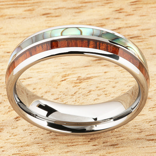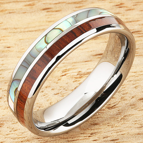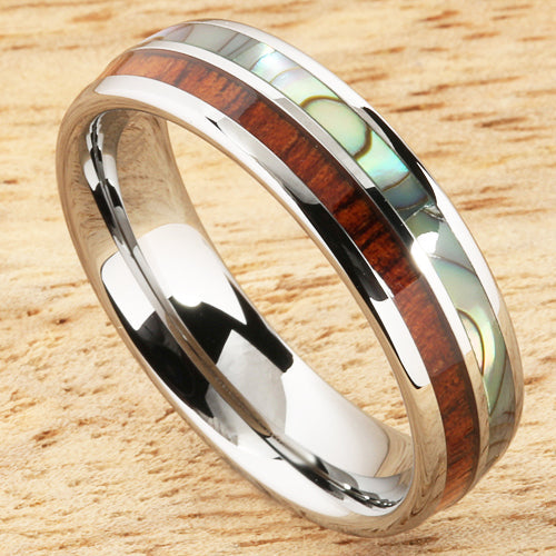 This beautiful ring made with Tungsten with Koa Wood Abalone Inlaid.