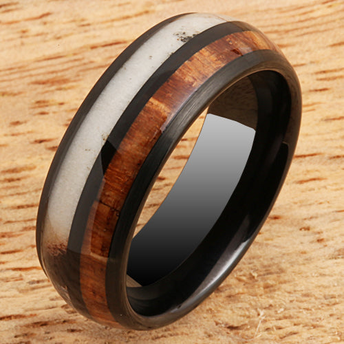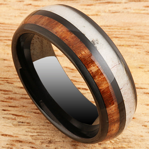 Koa Wood Ring Deer Antler Style Black Tungsten Wedding Ring 8mm Barrel Shape