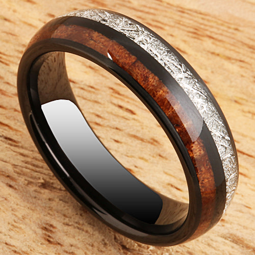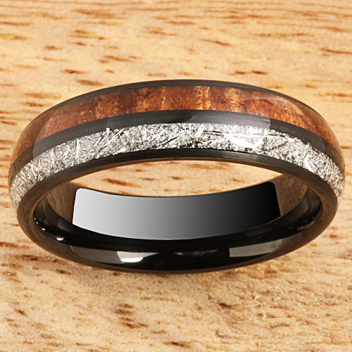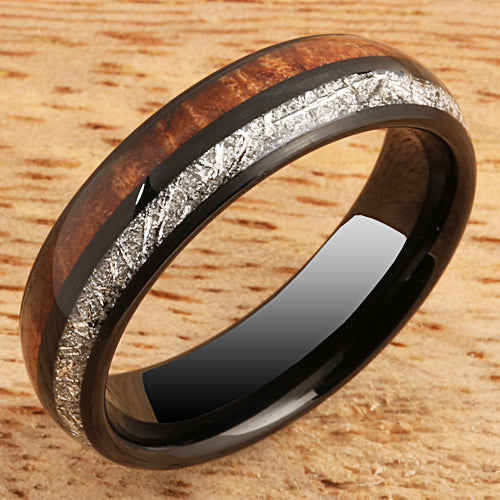 Koa Wood and Meteorite Pattern Black Tungsten Wedding Ring 6mm Barrel Shape
