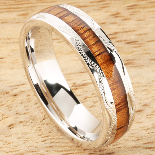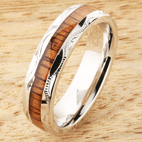 Sterling Silver Koa Wood Wedding Ring Hand-made Scroll Engraving 6mm