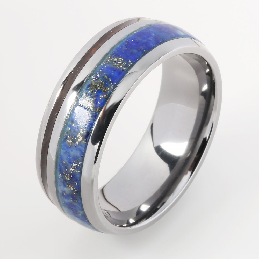 Tantalum with Koa Wood and Lapis Lazuli Inlaid Wedding Ring Barrel 8mm