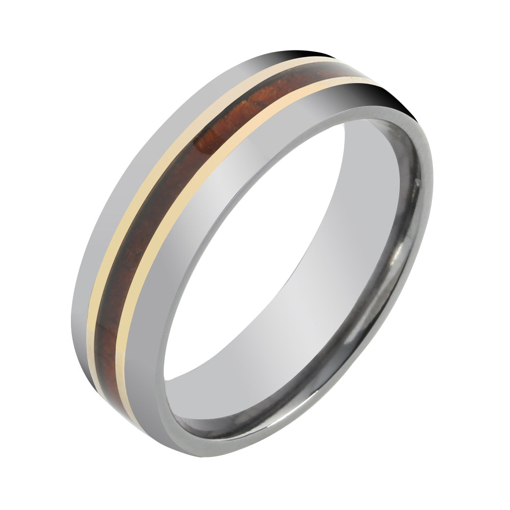 Tantalum with 14K Yellow Gold and Koa Wood Inlaid Wedding Ring Barrel 6mm