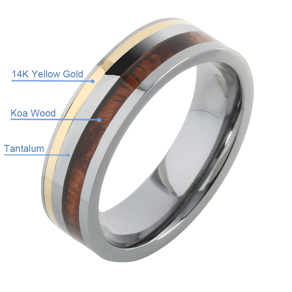Tantalum with 14K Yellow Gold and Koa Wood Inlaid Wedding Ring Flat 6mm