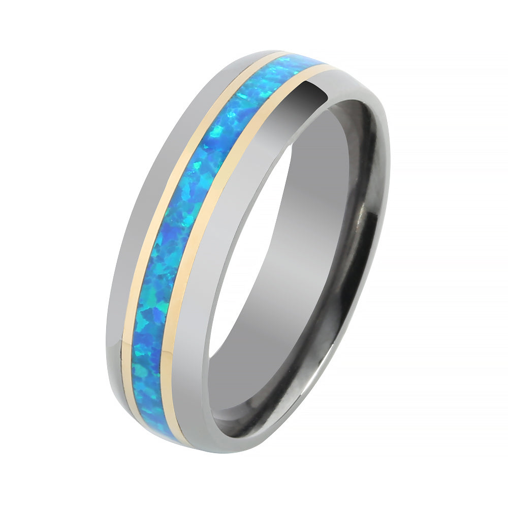 Tantalum with 14K Yellow Gold and Blue Opal Inlaid Wedding Ring Barrel 6mm
