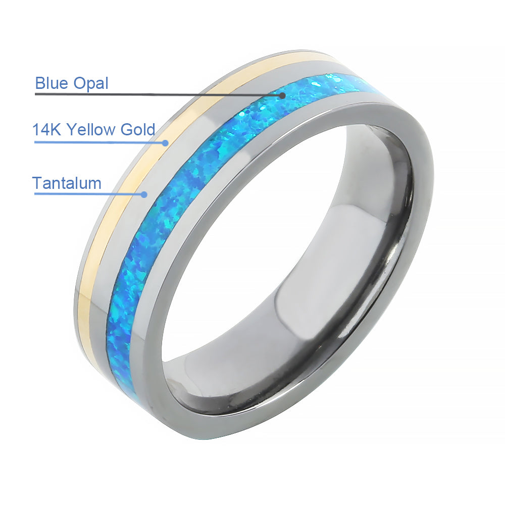 Tantalum with 14K Yellow Gold and Blue Opal Inlaid Wedding Ring Flat 6mm