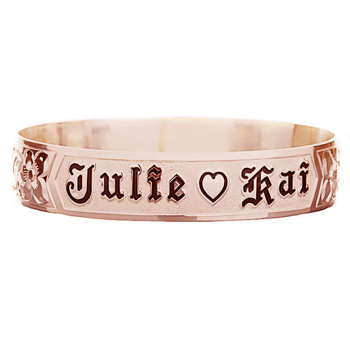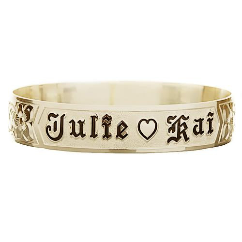 14K Gold Custom-Made Plumeria King Scroll Raise Letter with Black Enamel Smooth Edge Bangle (Thickness 1.25mm)
