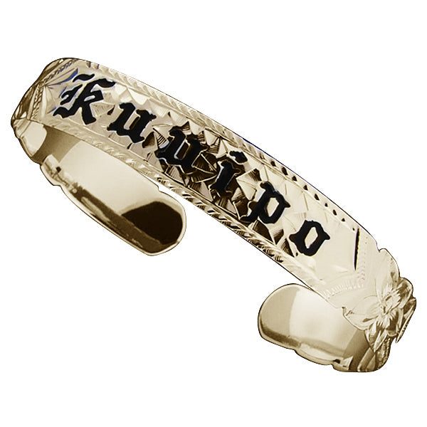 14K Gold Custom-Made Plumeria Scroll Black Enamel Letter Cut Out Edge Cuff Bangle